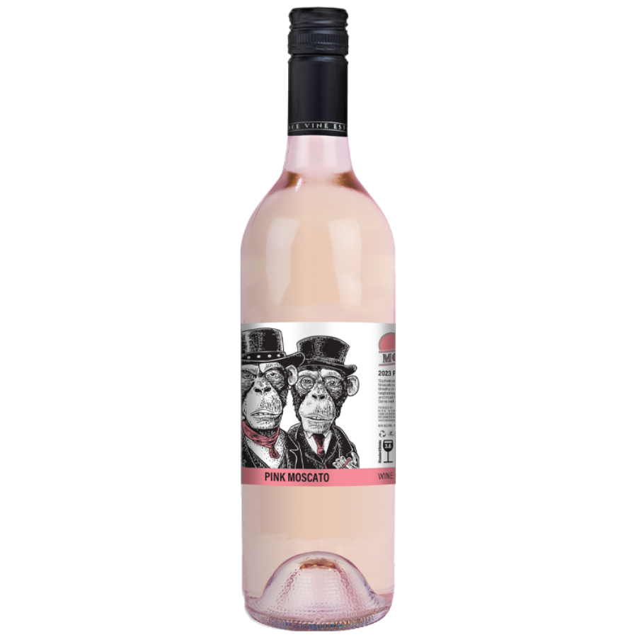 Two Monkeys Pink Moscato is sophisticated and bubbly. This frizzante style Moscato is pretty in pink and laced with sherbet. Sweet aromas of peach, rose petals and raspberries highlight the sweetness of this pink moscato.